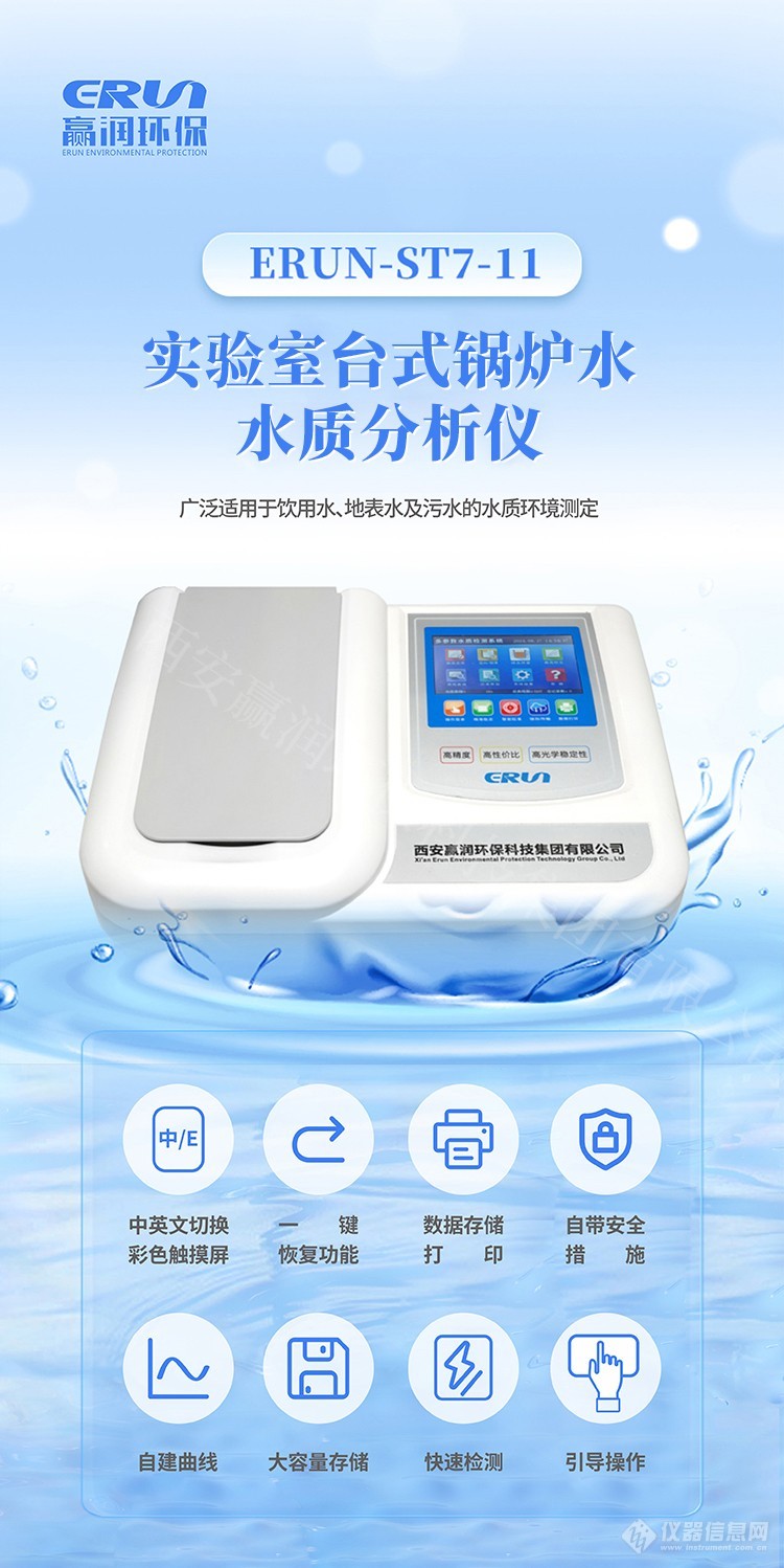 实验室台式锅炉水质分析仪 ERUN-ST7-11 严格依据《GB/T 1576-2018 工业锅炉水质》标准研发生产,可精准测定浊度、总硬度、全碱度、pH、电导率、溶解氧、铁、铜、溶解固形物、磷酸根、氯离子等关键水质参数。该仪器广泛适用于固定式蒸汽锅炉、汽水两用锅炉及热水锅炉的给水、锅水、蒸汽回水和补给水等水质的常规检测与分析。