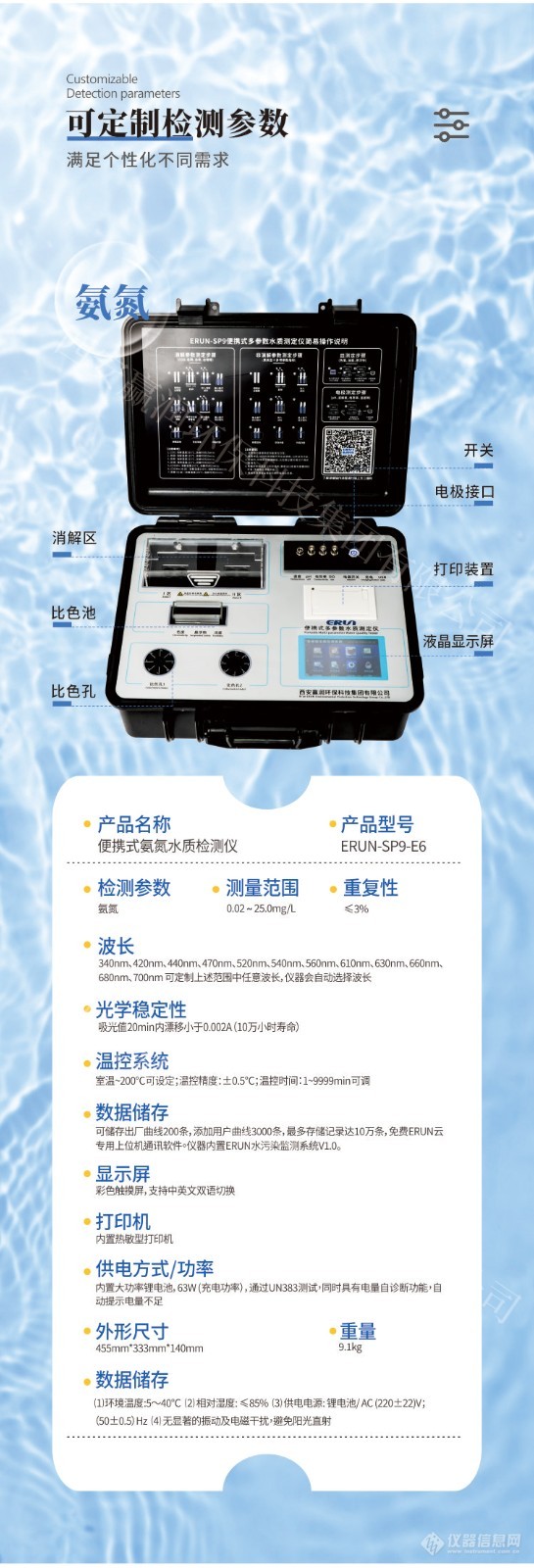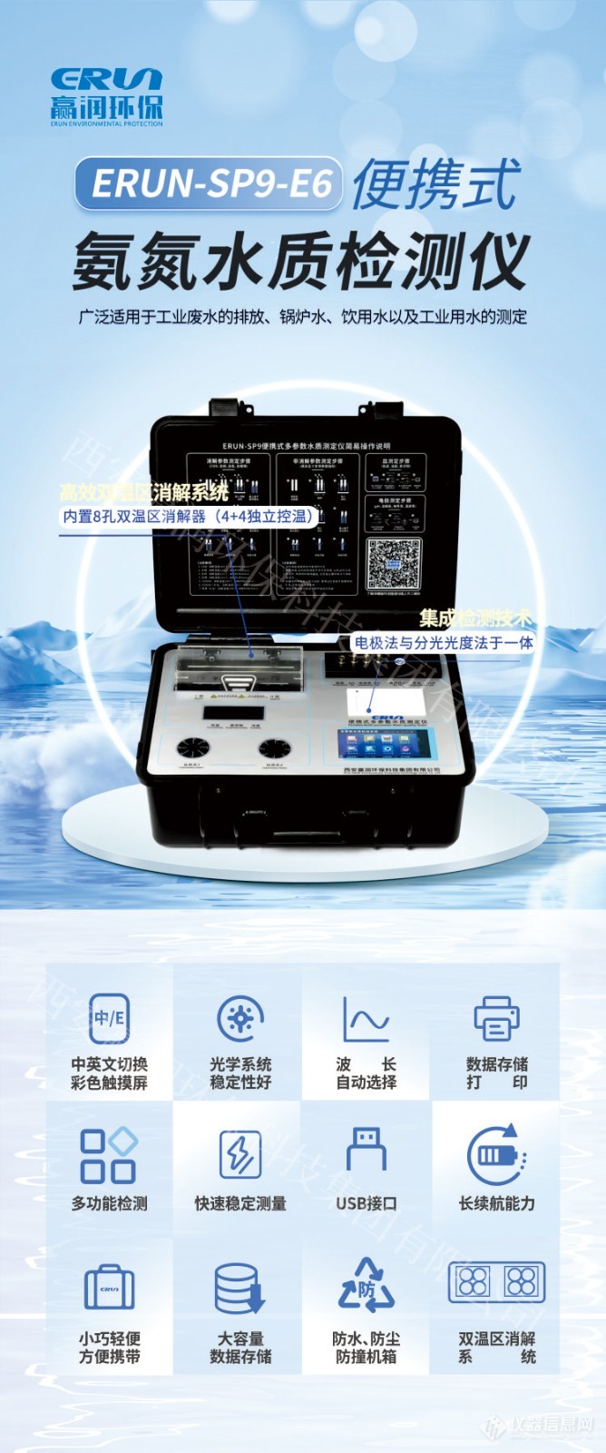 赢润ERUN-SP9-E6便携式水质氨氮测定仪是一款集智能化与便携性于一体的水质分析设备。仪器采用冷光源与窄带干涉光学技术,确保光学系统稳定、测量精度高;配备大屏幕LCD液晶显示屏,界面清晰,操作直观简便。整机设计轻巧,便于携带,适用于现场快速检测水体中氨氮含量,广泛应用于环境监测、水务管理及实验室等多种场景。
